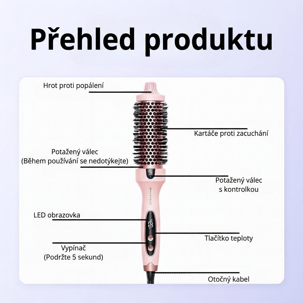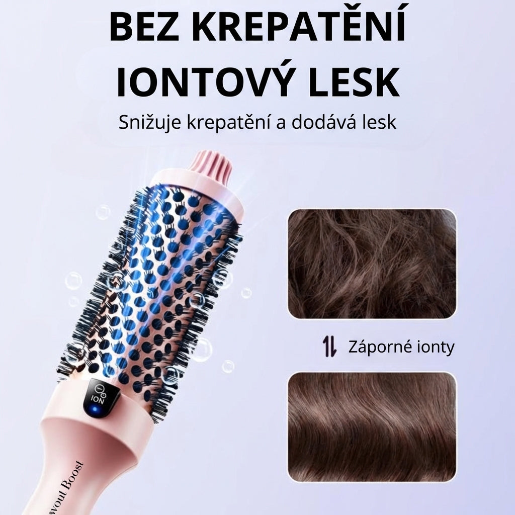 Pro hladký vzhled táhněte kartáč rovně po vlasech – nebo natočte konečky dovnitř pro vytvoření vln. Poté pramen uvolněte pro dokonalý výsledek jako ze salonu.
